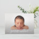 Os anúncios de natalidade bonitos apresentam sua foto favorita de recém-nascido com o nome de seu bebê em um roteiro elegante na frente e as estatísticas de natalidade e seus nomes em letras quentes no verso. Altere a cor no verso para qualquer cor que se ajuste à sua foto com a nossa ferramenta de seleção de cores. Adicione mais fotos de bebês nas costas, também!
