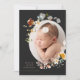 Este anúncio elegante e moderno de modelo de na moda vertical de fotografia de nascimento é um cartão de frente e verso duplo, com dois lados, que apresenta uma fotografia de recorte em forma oval da sua bebê recém-nascida e florais botânicos adoráveis que delineiam a imagem do bebê. Personalize este cartão com fotos com sua mensagem personalizada da família (mãe, pai, irmãos, se você quiser) que pode ser personalizada no verso com qualquer obrigado que você enviar por mensagem ou citação dos novos pais. Há também uma segunda foto horizontal no lado de trás. Este cartão de anúncio de bebê apresenta uma paleta colorida em tons vermelho, verde, amarelo, azul e rosa, pretos e invertidos.