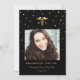 Anúncios de graduação em escola de enfermagem de preto e ouro com sua própria foto. Um caduceus, 'RN', e confetti flutua no topo do anúncio, com confetti sobreposto na foto. Na base você pode personalizá-lo com o nome da nova enfermeira, ano de aula e escola de enfermagem. Na parte de trás está um belo confete, caduceus, e o padrão de "parabéns"!