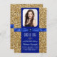 Bonito anúncio da graduação do azul real e do brilho dourado. Este belo anúncio de graduação em azul e ouro é facilmente personalizado com seus detalhes de fotos e eventos no estilo de fonte e cor, e com a redação de sua escolha. Você também pode mover a fita ou apagá-la neste anúncio elegante de graduação em azul e ouro.