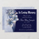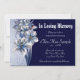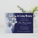 Belo azul-marinho real com flores azuis bebê e rochas personalizadas funeral e anúncio memorial e modelo de convite. Este belo memorial e anúncio de funeral azuis é facilmente personalizado para o seu evento, simplesmente escolhendo o botão "Personalizar!" para começar a adicionar detalhes do evento, estilo de fonte, tamanho de fonte e cor e texto. Observe que todos os adesivos, cartões e designs de convite que você encontrará no Zazzle são gráficos impressos sem joias reais, arcos, levantados, gravados, ou peças ou peças adicionadas.