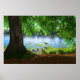 Uma pacífica tarde de verão ao lado de um lago parado, olhando sob a sombra de uma árvore de bordo vermelha com seus galhos e folhas verdes ofuscando a borda da água. Lírios de água flutuam sobre a superfície brilhante, e uma cegonha fica imóvel na água, enquanto libélulas e borboletas dançam entre os irlandeses e as catapultas ao longo do banco. A luz do sol brilha e acende as pequenas ondulações no lago.