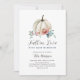 Celebrar a mãe com este belo convite de chá de fraldas de aquarela branca com ilustração de uma abóbora branca com rosa poeirento, flores rosas e azuis, cor-de-rosa e cinzentas, além de folhagem colorida e letra de caligrafia branca.