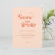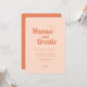 Um convite de casamento com a tipografia laranja retrorada é uma na moda e uma escolha única para uma ocasião especial. As letras laranja brilhantes e ousadas destacam-se contra o fundo de pêssego claro, criando um contraste visual impressionante. O convite é ainda reforçado pela adição de detalhes de design de sol e flor, acrescentando um toque de capricho e brincadeira ao design geral. O sol e as flores adicionam uma vibração alegre e alegre ao convite, fazer-o perfeito para uma celebração de casamento divertida e memorável.