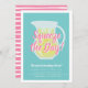 Convites de aniversário de verão bonitos apresentam um jarro de limonada gelada com "apertar o dia" em letras rosas em um fundo turquesa vibrante. Personalize com seus detalhes de festa de aniversário abaixo.