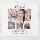 Crie sua própria colagem de fotos exclusiva. Use quatro, quatro da sua foto favorita. Personalizar e um nome e idade/data. Um fundo branco, texto preto.
