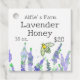 Uma etiqueta de latas/jarro de mel com lavanda e uma abelha de mel ilustrada com aquarela com um texto de cinza escura que você pode editar com seus detalhes. No verso está coordenando a sombra de cinzas e mais textos relacionados aos negócios que você pode editar.
