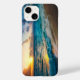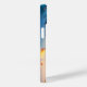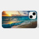 O caso do Apple iPhone 14 é mostrado com uma impressão de foto de uma bela cena da praia do oceano por pôr do sol. Personalizar ou comprar como está. Imagem do stock