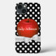 capas de iphone bonito com gráficos de pequeno padrão floral em vermelho suculento, contra fundo bolinhas preto e branco. Os gráficos de uma fita branca e um arco atravessam a parte inferior da maçã. Personalize o texto em branco. Excelente para si mesmo ou como uma ideia de presente para o seu professor favorito.