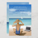 Uma cena bonita da praia com um fêmea assentado olhando a distância para um veleiro. Seu computador é ao lado dela na areia. Um convite de festas maravilhoso da aposentadoria para uma fêmea trabalhadora.