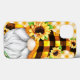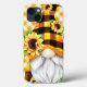 Um pequeno gnomo adorável numa impressão de xadrez de búfalo amarela e preta juntou alguns girassóis. Fundo de Gingham amarelo. O texto diz "Aproveite as Coisas Pequenas".
