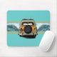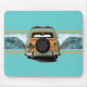 Um arborizado do vintage equipado com um par de longboards, achados a onda de quebra dobro perfeita. A onda ilustrada tem uma imagem de fantasma de um impressão do pareau do hibiscus. A matrícula de Califórnia do vintage diz Beachin'. Este design vem em colorways do azul e do aqua.