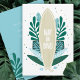 Sobe! Surf tropical convite para chás de fraldas com pranchas naturais de grãos de madeira e folhas tropicais em tons de azul e verde aqua.