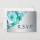 Esta RSVP de Casamentos de Prata e Água contemporânea apresenta um aqua bonito (ou choro - com uma dica de cor rosa) no canto superior esquerdo. Ao fundo há uma base metálica prateada brilhante. O reverso também tem um pequeno buquê de rosa aqua na parte inferior da carta.