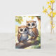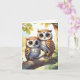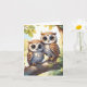 Corujas kawaii chibi juntas em um galho de árvore decoram este cartão de cumprimentos em branco.