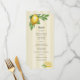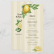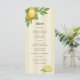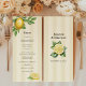 Melhore sua recepção de casamento com este elegante menu com o tema dos citros. Apresentando lindos limões de aquarela e folhas verdes, esta design traz um toque de elegância mediterrânica para o seu casamento. Perfeito para comemorações rústicas, primavera, de verão ou inspiradas em jardim. Este menu combina a beleza natural com a sofisticação do eterno, e exibe lindamente a sua louça curada. Personalizável para combinar com o tema do seu casamento, é o detalhe perfeito para uma experiência inesquecível de jantar.
