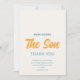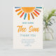 Família obrigado e amigos por seus presentes de chá de fraldas com esse cartões de agradecimentos de chá de fraldas de garotos giros. Apresenta o texto "Aqui Vem o Filho" na tipografia da na moda com um sol de cor aquosa brilhante sobre fundo creme macio. As costas estão decoradas com um padrão solar. Facilmente personalizável. Original Watercolor © Michele Davies.
