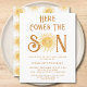 Convide a família e os amigos para o seu chá de fraldas temático com este belo convite de chá de fraldas dos rapazes. Apresenta o texto "Aqui Vem o Filho" na tipografia da na moda com um lindo sol sorridente de aquarela amarela. As costas estão decoradas com um padrão solar. Facilmente personalizável. Original Watercolor © Michele Davies.