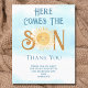 O cartões de agradecimentos de chá de fraldas deste rapaz do orçamento apresenta o texto "Aqui Vem O Filho" em tipografia retrô azul com uma cor amarela do sol, céu azul e nuvens. Facilmente personalizável. Porque nós criamos a nossa trabalho de arte, você não encontrará esta imagem exata de outros designers. Original Watercolor © Michele Davies.