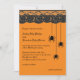 As aranhas delicados penduram de uma beira ilustrada foto do laço neste convite do casamento do Dia das Bruxas. A parte traseira é decorada com um candelabro de cristal preto e os bastões em vôo. Mostra-se no papel básico; contudo, eu recomendo o peso e a textura do papel de linho.