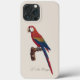 A imagem apresenta uma ilustração detalhada da Arara-vermelha (Ara macao), também conhecida como Arara-de-bico-vermelho, elegantemente empoleirada em um galho texturizado. Esta obra de arte é característica do refinado estilo de história natural iniciado por Jacques Barraband, cuja atenção meticulosa à cor e à anatomia trouxe aves exóticas à vida em publicações científicas iniciais. A plumagem vermelha vibrante da arara domina a composição, complementada por faixas impressionantes de amarelo dourado e azul profundo ao longo de suas asas e cauda alongada. Seu bico robusto e curvo e a pele facial pálida, delicadamente marcada com padrões de penas, são renderizados com precisão, enfatizando tanto a beleza quanto a precisão biológica.