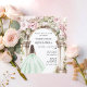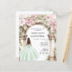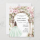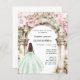 Um grande arco de mármore decorado com flores cor-de-rosa. Uma garota com um vestido verde. Personalize e adicione um nome e detalhes. 1 folha = 1 convite impresso de borda a borda.