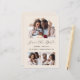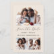 Esta simples e minimalista "Save the Date card" apresenta uma fotografia em forma de arco no topo e duas fotografias quadradas no fundo. No meio, as palavras "Salvar a Data" aparecem no elegante guião preto, seguido dos nomes dos casais, da data do casamento e da cidade em sans serif em um fundo bege. Adicione uma mensagem mais detalhada com informações adicionais no verso.