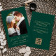Este simples e minimalista Cartão Salvar a Data apresenta um arco de fotos acima das palavras "Salvar a Data" em um elegante roteiro de escrita manual dourada, seguido pelos nomes do casal, data do casamento e cidade em sans serif em um fundo verde esmeralda. Adicione uma mensagem mais detalhada com informações adicionais na parte de trás, juntamente com um código QR que os seus convidados podem usar para visitar o seu site de casamento.