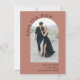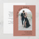 Bela simplicidade e estilo artístico fazem com que este casamento artístico moderno salve a pop com apelação o cartão de data. ele apresenta um modelo de foto em forma de arco na frente do cartão para carregar sua foto desejada. Há uma modelo de texto na frente da carta para personalizar com os nomes da noiva e do noivo e a data de casamento planejada. A parte traseira deste cartão tem um exemplo de mensagem com detalhes adicionais para personalizar. Mostrada aqui com fundo terra-terra-cotta, essa carta está disponível em outras cores também.
