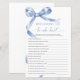 Arco azul "Who Knows The Bride Best" Game - Adicione alguma diversão ao seu chá de panela com este charmoso cartão de jogo com um delicado design azul de arco. Este jogo "Quem conhece melhor a noiva" é perfeito para envolver convidados e celebrar o estilo da noiva. Com uma escrita elegante e sotaques femininos, este cartão de jogo é uma bela adição a qualquer tema chá de panela, fazer-o como uma lembrança memorável para a noiva e seus entes queridos. *** Digite H124 na pesquisa da loja para encontrar todos os itens correspondentes *** Ou visite nossa Coleção de Arcos Azuis. *** Este design de alta qualidade é fácil de personalizar para combinar as cores do casamento, estilos e temas. Para mais personalização, clique no link "Editar usando a Ferramenta de Design" e use nossa ferramenta design para modificar esse modelo. Se precisar de ajuda ou itens correspondentes, entre em contato comigo.