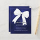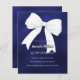 Um fundo azul marinho, incolor, decorado com um arco branco grande. Personalize e adicione um nome e detalhes da parte. 1 folha = 1 convite impresso de borda a borda.
