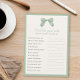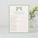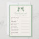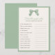 Perguntas editáveis sobre o título do jogo e texto para o chá de fraldas ou chá de panela. Apresenta um arco pintado manualmente com uma xadrez sutil no fundo de Sage Green e marfim; borda e cor de fundo editáveis na frente e atrás.
