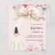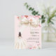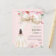 Um fundo rosa pincelado elegante, decorado com um grande arco colorido de creme, flores cor-de-rosa e uma garota com um vestido colorido creme. Personalize e adicione um nome e detalhes da parte. 1 folha = 1 convite impresso de borda a borda.