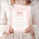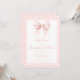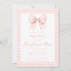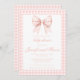 Adorável convite de chá de menina apresentando uma charmosa cor-de-água cor-de-rosa-pastel ilustrando uma fita de arco rosa-quente e giro em um plano de fundo de gingham. Ideal para chás de bebês, convites de aquarela e comemorações de primavera/verão.