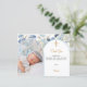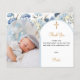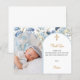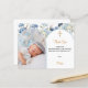 Adicione uma foto vertical. Uma moldura de foto azul em forma de arco decorada com flores azuis. Fundo branco. Personalize com nome e detalhes.