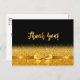 Um fundo preto elegante e um arco de ouro e fita falsa. Na frente, um estilo escrito à mão e o texto: Obrigado! Voltar: Modelo para sua nota de agradecimento e nome/nomes Perfeito para uma festa de aniversário, aniversário, casamento, chá de panela ou chá de fraldas.