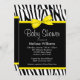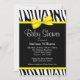 Um padrão de zebra preto e branco moderno com um gráfico de arco amarelo é apresentado neste convite para chás de fraldas divertidos. Perfeito para uma garota, um garoto ou um chá de fraldas neutro de gênero!Os Designs são ilustrações/gráficos impressos - NÃO É REAL.