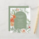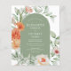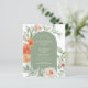 Este design de casamento romântico apresenta um arco em sage verde enquadrado por flores de água em tons de pêssego e folhagens verdes. Personalize o convite com os nomes dos noivos em uma combinação de tipografia serifa e sem serifa e os detalhes do casamento em sem serifa e itálico. O verso é uma cor sólida de sage verde. Ideal para um casamento de primavera ou verão.