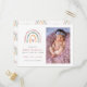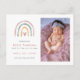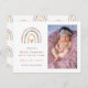Um anúncio de nascimento moderno e simples que apresenta arco-íris a aquarela pastel com coração no centro. Personalize-o com o nome do seu recém-nascido, os sinais vitais e os detalhes do evento.