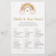 Estes elegantes "What's In Your Purse Cards" são uma forma excelente de se divertir com o seu Chá de fraldas e é garantido ser um grande sucesso! Simplesmente passá-los durante o Chá de fraldas, onde os convidados se divertirão a passar pelas suas bolsas e a verificar os itens que têm na lista. A pessoa com mais pontos ganha! A design apresenta nosso arco-íris desenhado pela mão e nuvens em cores neutras em tons de terra com estrelas douradas falsas.