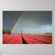 Poster impressão de um arco-íris colorido num céu escuro sobre um moinho de vento e um cheio de campo de tulipas vermelhas brilhantes durante uma tempestade primavera num cenário perto de Amesterdã, nos Países Baixos.