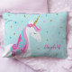 Este travesseiro apresenta um belo e branco design unicórnio arco-íris com estrelas e falso brilho dourado num fundo de aqua pastel. Personalize-o com um nome.