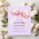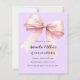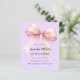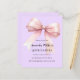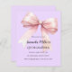 Lavanda macia, fundo cor-de-roxo, decorado com um arco cor-de-rosa grande. Personalize e adicione um nome e detalhes da parte. 1 folha = 1 convite impresso de borda a borda.