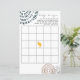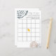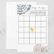 Jogo de bingo de bebê com direções no topo e com quadrados 5x5 e pintinho de bebê no centro vestindo arco rosa com designs boho nos cantos.