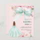 Um elegante fundo cor-de-rosa pincelado, decorado com um grande arco verde sábio, flores cor-de-rosa e uma menina de vestido verde. Personalize e adicione um nome e detalhes da parte. 1 folha = 1 convite impresso de borda a borda.