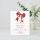 Um fundo branco, decorado com um grande arco vermelho. Personalize e adicione um nome e detalhes da parte. 1 folha = 1 convite impresso de borda a borda.