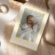 Cartão de nascimento branco e doce, com fotografia desenhada à mão de uma linha amarela com arcos.