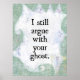 Eu ainda discuto com seu fantasma - abstrato de texto pungente com espirais verdes de seafoam sobre um fundo branco com sotaque lavanda e amarelo.