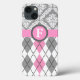 Argyle e rosa da cor damasco, iPhone cinzento do monograma 6 casos. Estas características de design bonitos, femininos um teste padrão do argyle em cor-de-rosa, em cinzento, em branco com linhas intercrossing pretas e damasco do branco cinzento na divisória superior. Há uma banda cor-de-rosa através dela e de um círculo com seu monograma. Este design elegante, elegante e à moda é completamente customizável. Você pode mudar a cor do fundo - cinza e cor de texto que escolhe sobre de 200 cores da escala de cores de Zazzle. Contemporâneo e moderno com um dom retro.