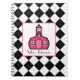 Um caderno espiral que caracteriza um design preto do argyle. Escola cor-de-rosa dentro do quadrado no centro. Personalize com seu nome.